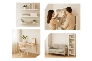 Bayangkan: ruang tamu kecil tetap rapi karena buku, tanaman mini, dan dekorasi tersusun di rak dinding. Atau dapur mungil yang lega karena panci & peralatan dapur digantung rapi di dinding, bukan menumpuk di meja.
